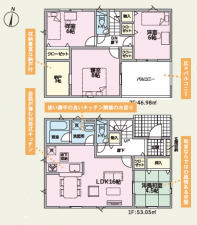 - システムキッチン、カウンターキッチン、シャンプードレッサー、洗浄便座、浴室乾燥機、追い焚き、複層ガラス、モニタ付インターホン、駐車場3台分、床下収納、エコキュート、トイレ2箇所